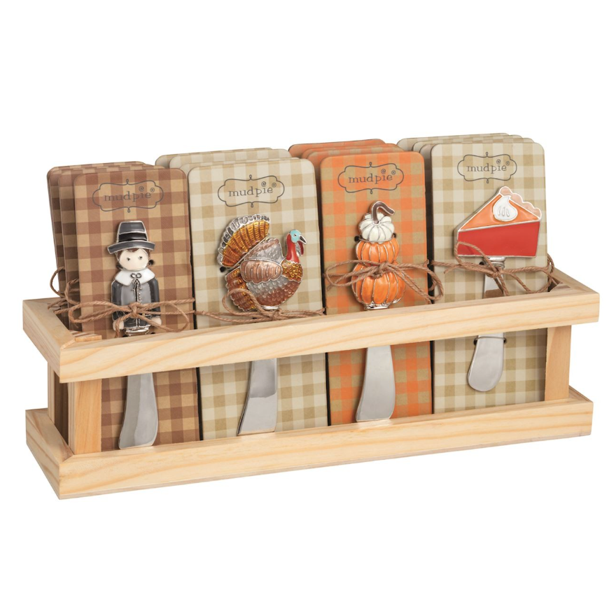 Choose from a Pilgram, Turkey, Pumpkins or Pumpkin Pie spreader for your Thanksgiving table,
