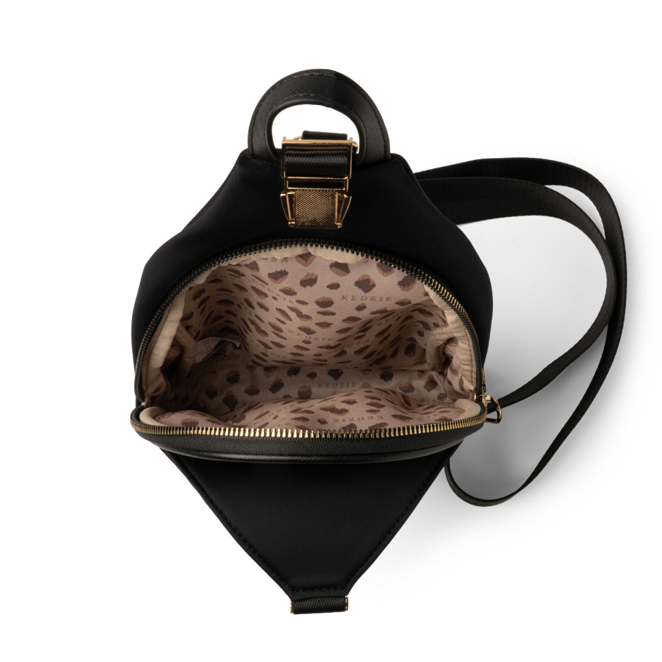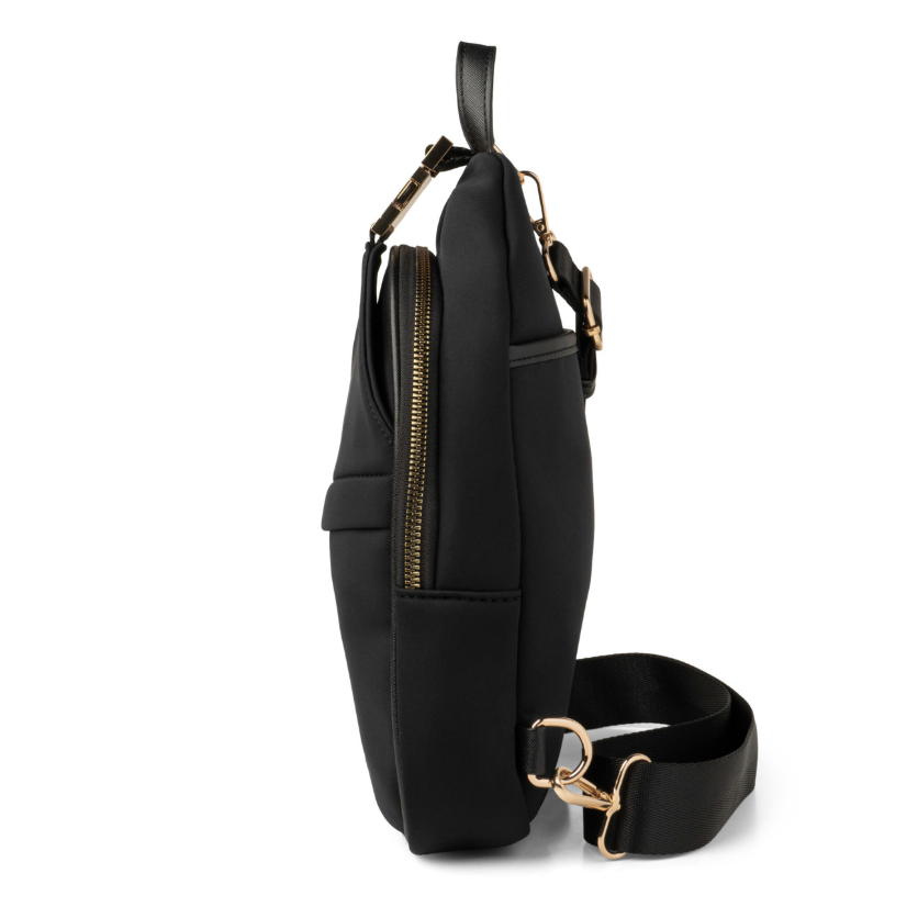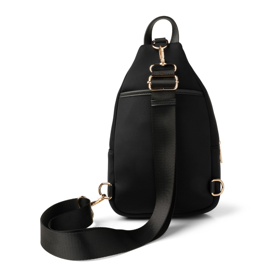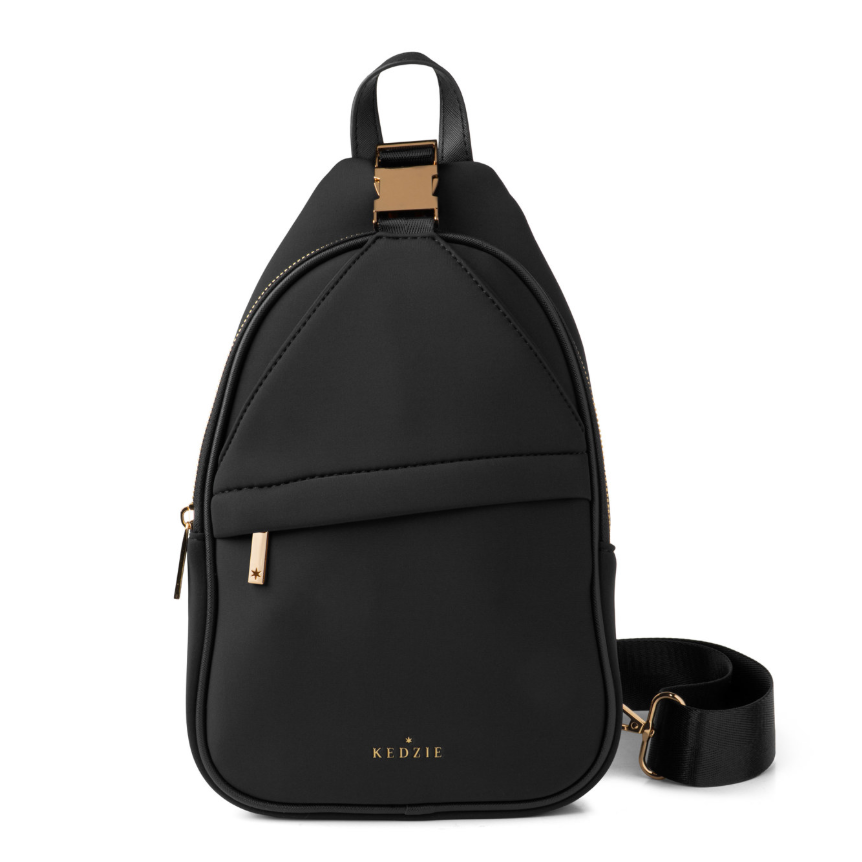 Crafted from ultra-premium neoprene, this stylish sling bag offers a soft touch and effortless cleaning, ideal for everyday use. Shoppers will appreciate the organizer pockets, roomy main section, and chic gold buckle detail. Resistant to spills, dirt, and various weather conditions, it’s a durable choice for daily adventures. Enhance your look and sales by pairing it with Kedzie Interchangeable Bag Straps. Key features include water-resistant neoprene, multiple pockets including a buckled slip pocket and zippered front pocket, vegan leather accents, and a removable, adjustable 55" strap.