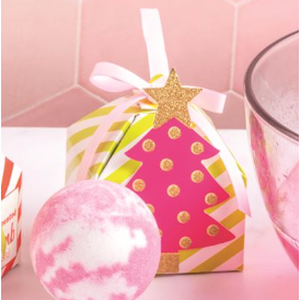 Scented bath bomb comes wrapped in festive cardstock ornament gift box with top hanging loop. Comes in cardstock displayer.