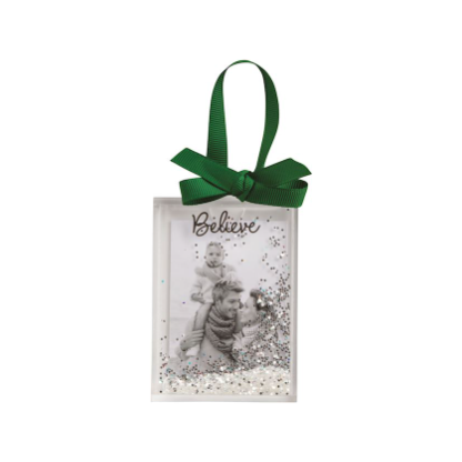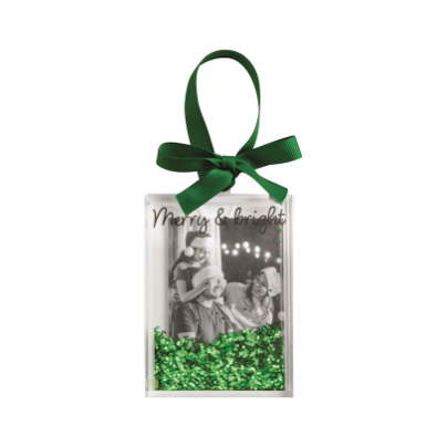 Acrylic block photo ornament features encased glitter and grosgrain bow hanger. Holds 3" x 2" photo.