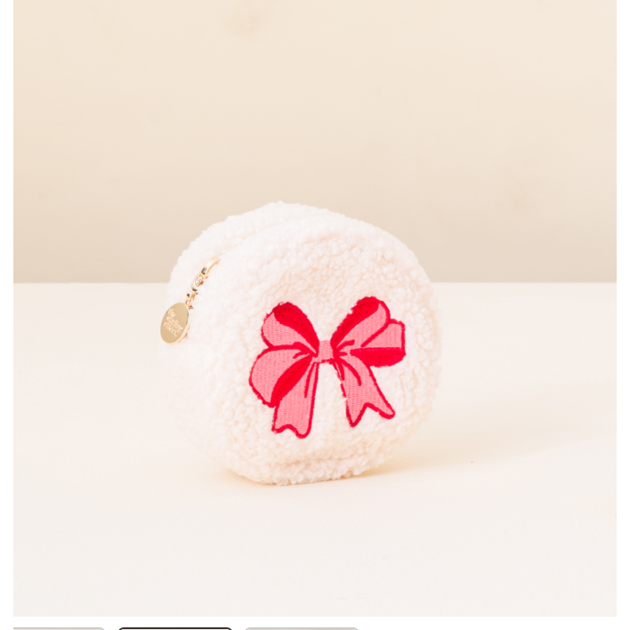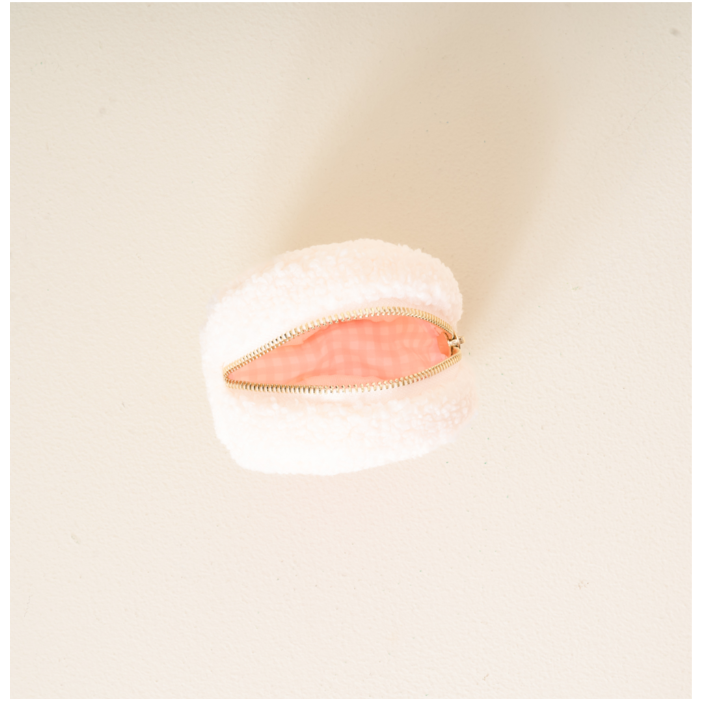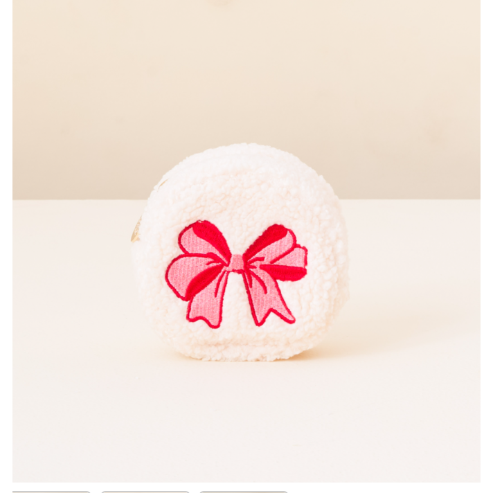 Add a festive touch to your everyday routine with our Christmas Circle Teddy Pouches. Made from soft sherpa material with adorable holiday details, it features a darling, wipeable lining inside and gold hardware. Pair your circle teddy pouch with our matching rectangle teddy pouches! Perfect for merchandising products together! Circle size: 4.5" dia, 2" w.